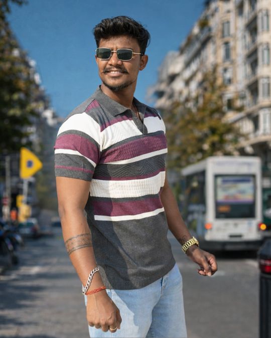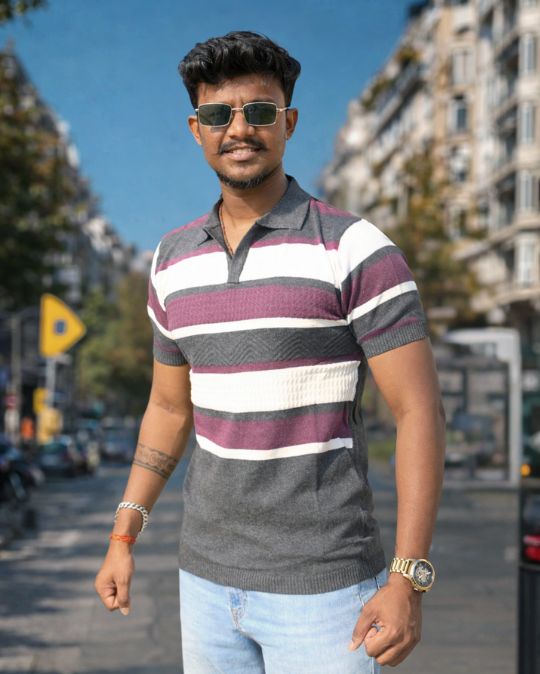 Enhance your everyday wardrobe with this Men’s Striped Knit Polo Neck T-Shirt, designed to deliver a perfect balance of comfort, elegance, and modern style. Crafted from premium knitted fabric, this t-shirt features a classic polo-inspired open collar that adds a refined touch while maintaining a relaxed feel.