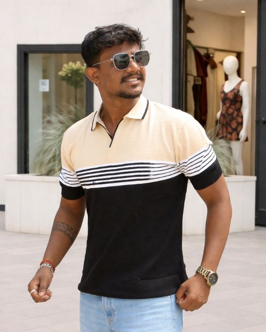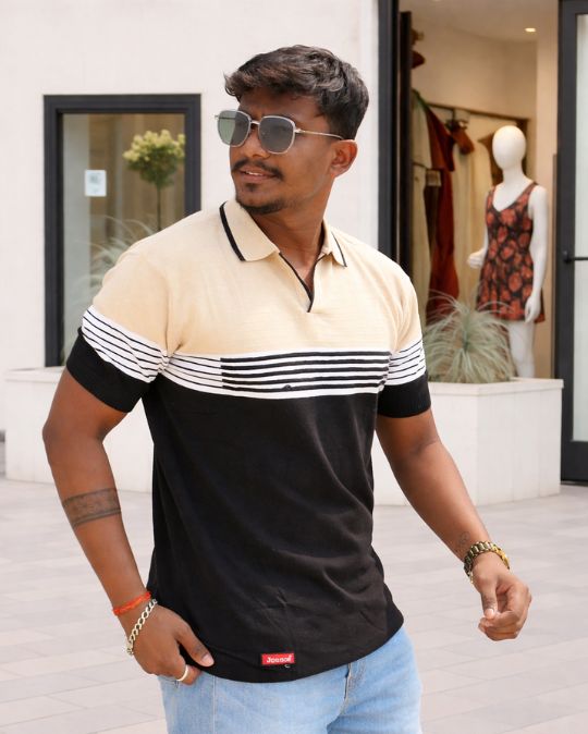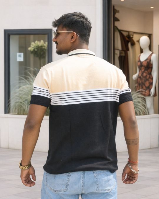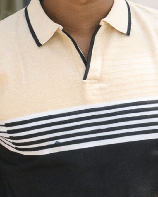 Upgrade your everyday style with this Men’s Classic Knit Polo Neck Color Block T-Shirt, designed for effortless comfort and modern appeal. Featuring a refined beige upper panel paired with bold color blocking and horizontal stripe detailing, this t-shirt strikes the perfect balance between smart and casual.