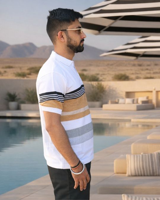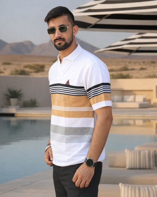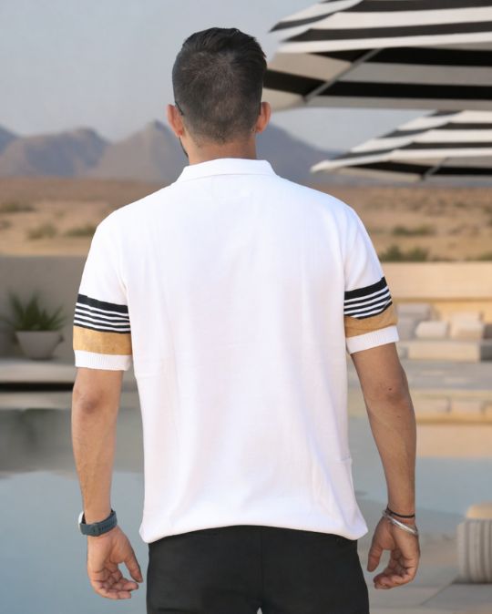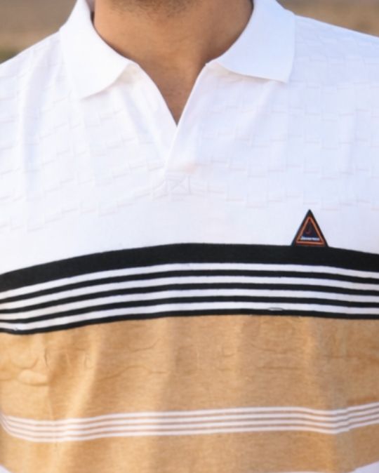 The textured knit upper adds depth and character, while the horizontal stripe detailing across the chest gives it a sporty yet sophisticated vibe. Finished with a structured polo collar and ribbed sleeve hems, this t-shirt is perfect for casual outings, weekend plans, or semi-casual occasions. Pair it with denim or chinos for an effortlessly polished look.