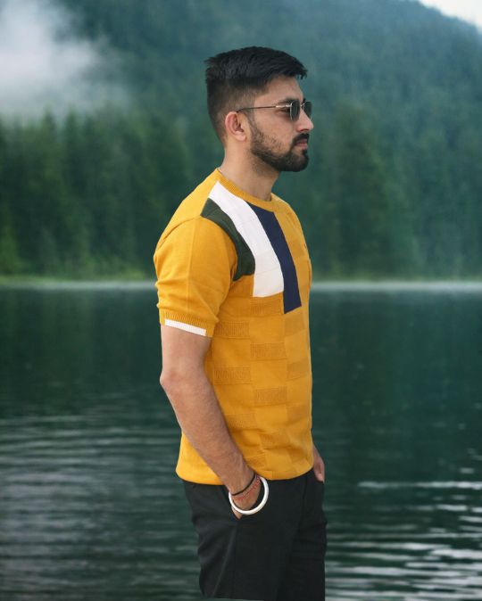 Trendy men’s t-shirt in a rich mustard shade with a premium textured knit finish. Features stylish multi-color front panels and a comfortable round neck design, perfect for casual outings and everyday wear.