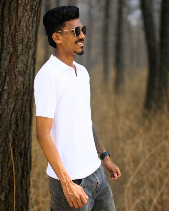 Bring effortless sophistication to your everyday wardrobe with this Men’s Solid Ribbed Polo Knit White T-Shirt. Designed in a clean and elegant off-white tone, this t-shirt features subtle vertical rib detailing that adds texture and a refined finish. The structured polo collar enhances its smart appeal, making it a perfect choice for casual outings, office-casual wear, and relaxed weekend styling. Crafted from soft, breathable knit fabric, it offers all-day comfort while maintaining a polished silhouette. Pair it with jeans, chinos, or tailored trousers for a timeless and versatile look.